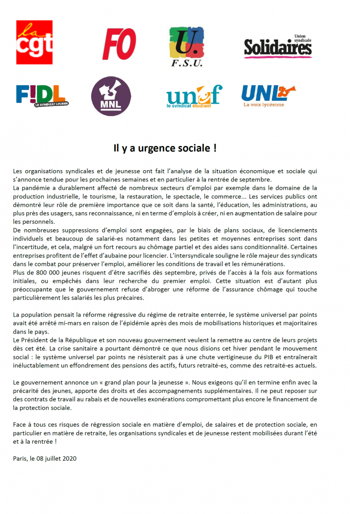 Les organisations syndicales et de jeunesse ont fait l’analyse de la situation économique et sociale qui s’annonce tendue pour les prochaines semaines et en particulier à la rentrée de septembre.