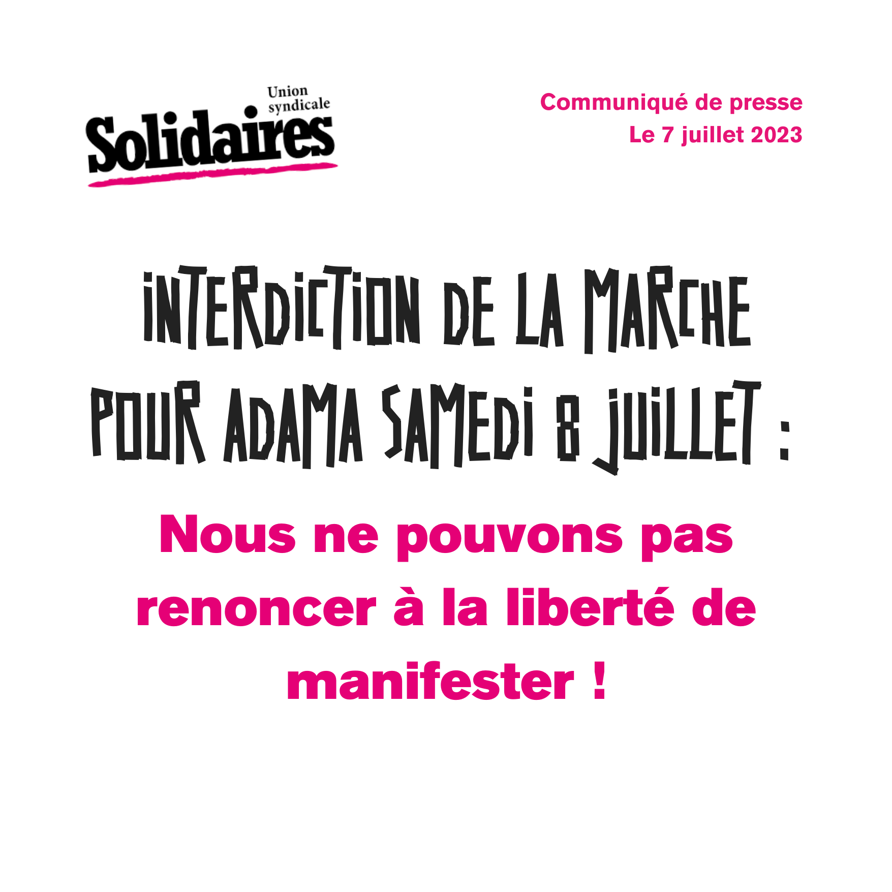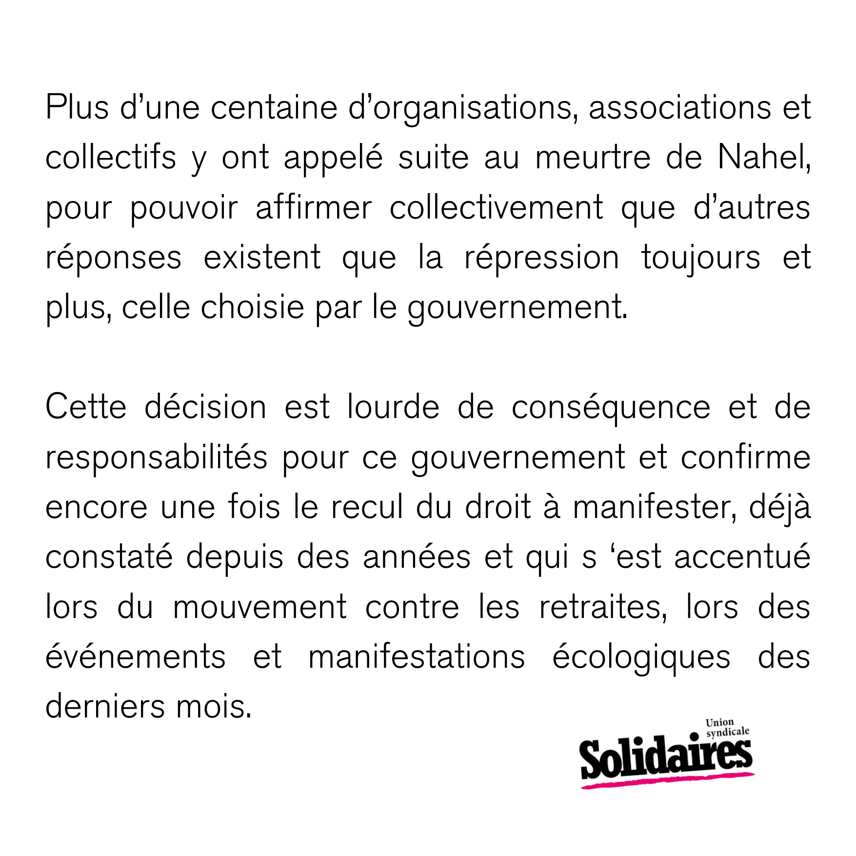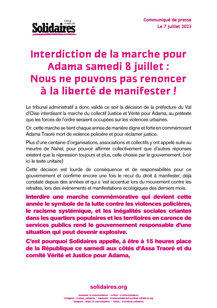 Cette décision est lourde de conséquence et de responsabilités pour ce gouvernement et confirme encore une fois le recul du droit à manifester, déjà constaté depuis des années et qui s ‘est accentué lors du mouvement contre les retraites, lors des événements et manifestations écologiques des derniers mois.
