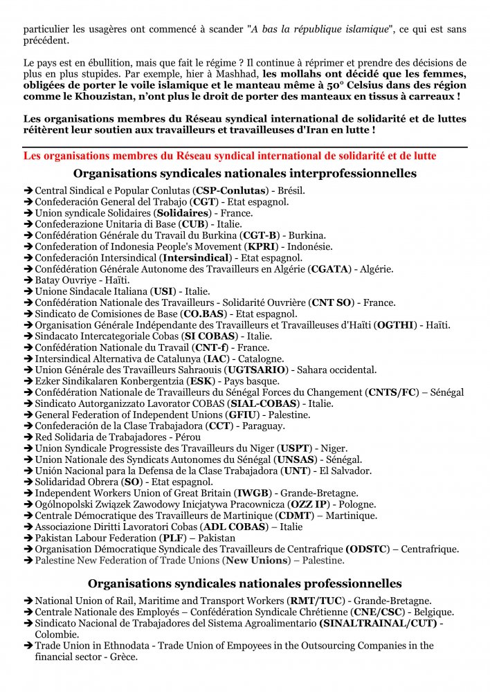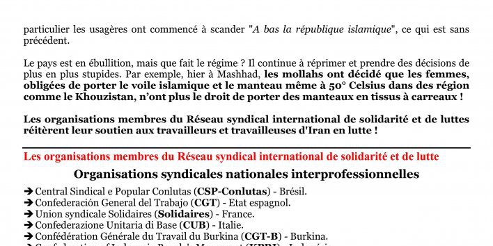 Les organisations membres du Réseau syndical international de solidarité et de luttes réitèrent leur soutien aux travailleurs et travailleuses d'Iran en lutte !