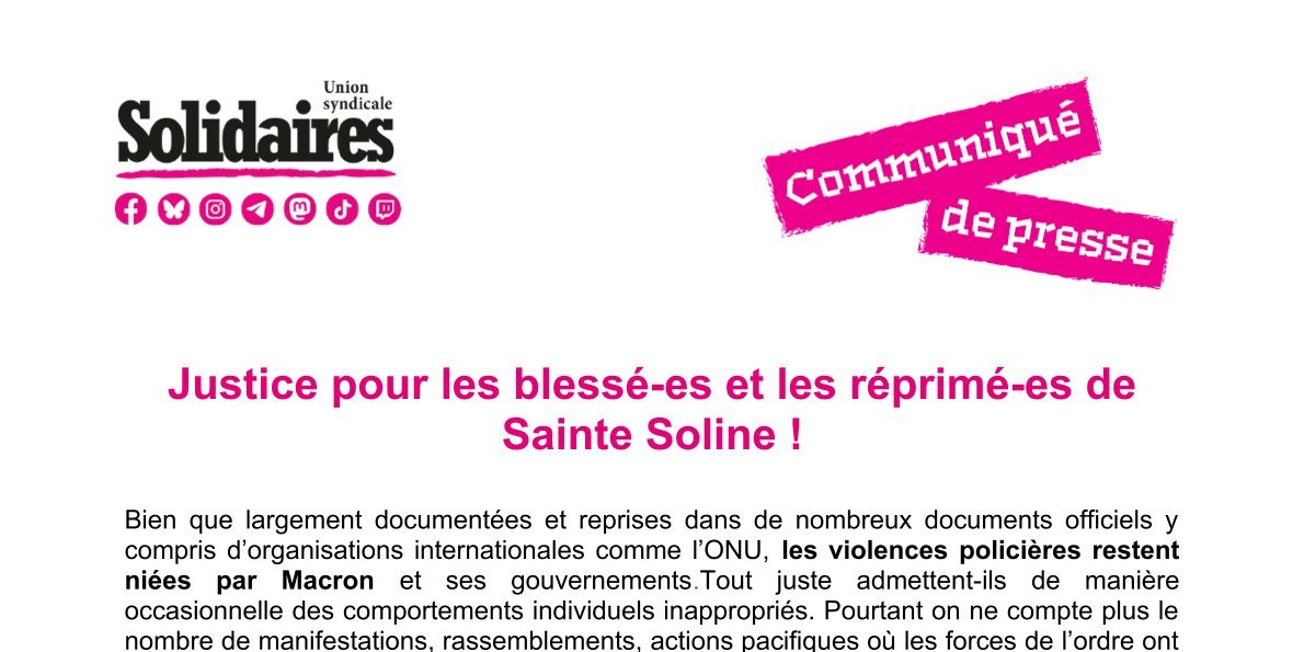 L’Union syndicale Solidaires exige en outre que soit mis fin aux poursuites engagées contre les militant·es injustement mis en cause dans les affrontements de Sainte Soline alors que la responsabilité des violences incombe de manière indiscutable aux forces de l’ordre.