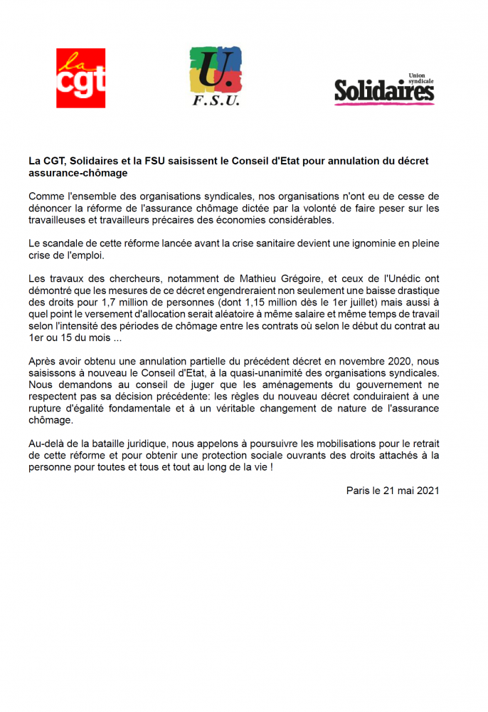 Après avoir obtenu une annulation partielle du précédent décret en novembre 2020, nous saisissons à nouveau le Conseil d'Etat, à la quasi-unanimité des organisations syndicales. Nous demandons au conseil de juger que les aménagements du gouvernement ne respectent pas sa décision précédente: les règles du nouveau décret conduiraient à une rupture d'égalité fondamentale et à un véritable changement de nature de l'assurance chômage.
