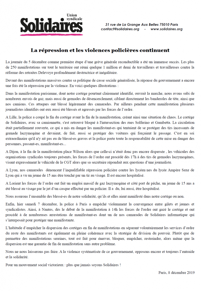 Enfin, hier samedi 7 décembre, la police à Paris a empêché violemment la convergence entre gilets et jaunes et syndicalistes. Ainsi, à Nantes, dès le début de la manifestation à 14h les forces de l'ordre ont gazé le cortège et ont procédé à de nombreuses arrestations de manifestant-es dont un de nos camarades de Solidaires informatique qui s’interposait pour protéger une manifestante.