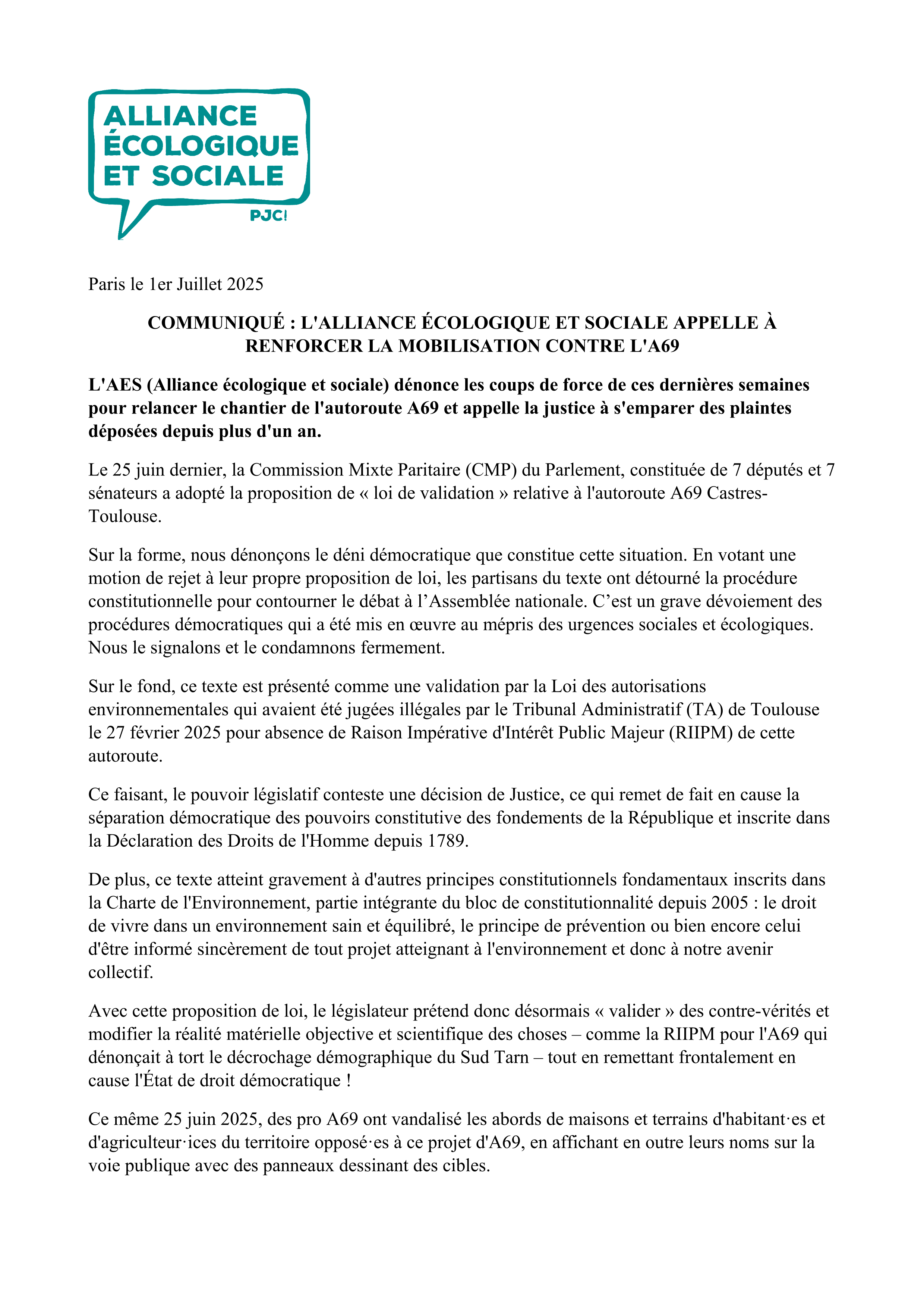 L‘AES (Alliance écologique et sociale) dénonce les coups de force de ces dernières semaines pour relancer le chantier de l’autoroute A69 et appelle la justice à s’emparer des plaintes déposées depuis plus d’un an.