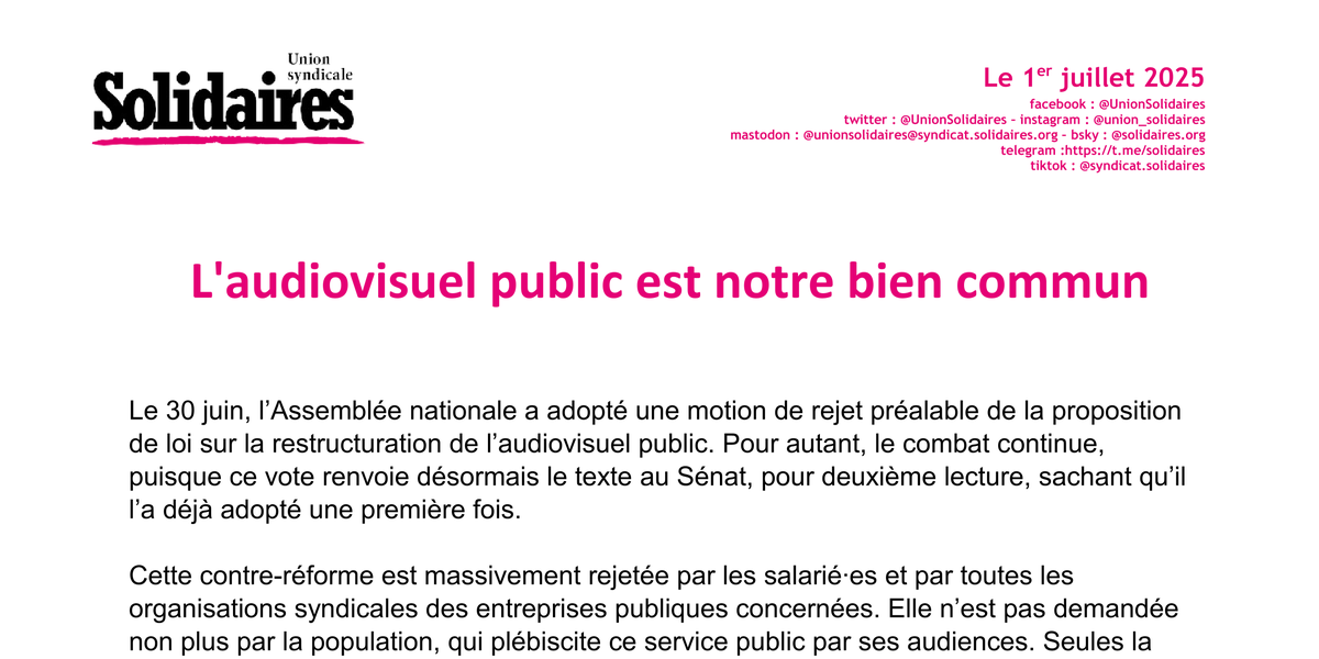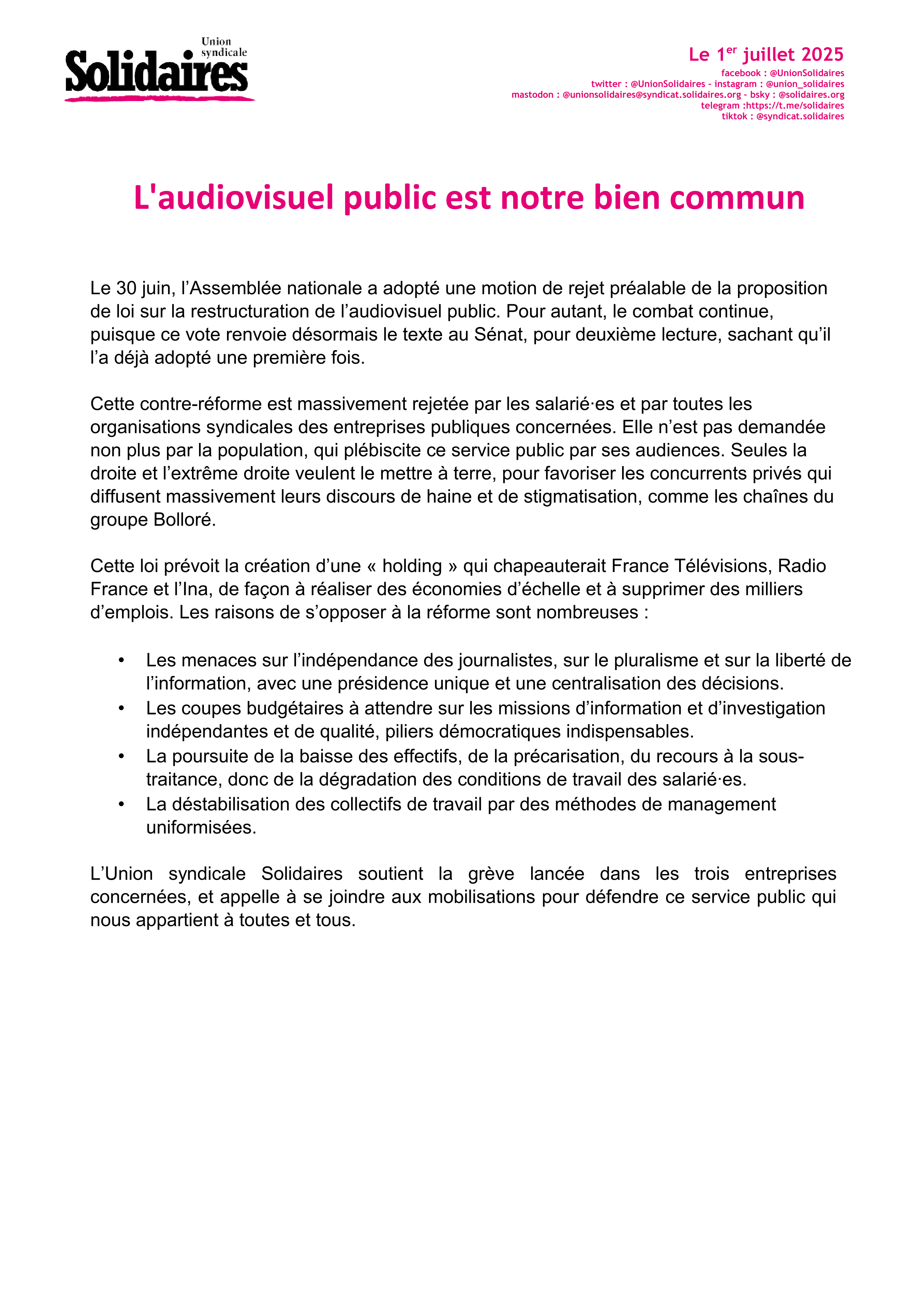 Cette contre-réforme est massivement rejetée par les salarié∙es et par toutes les organisations syndicales des entreprises publiques concernées. Elle n’est pas demandée non plus par la population, qui plébiscite ce service public par ses audiences. Seules la droite et l’extrême droite veulent le mettre à terre, pour favoriser les concurrents privés qui diffusent massivement leurs discours de haine et de stigmatisation, comme les chaînes du groupe Bolloré.