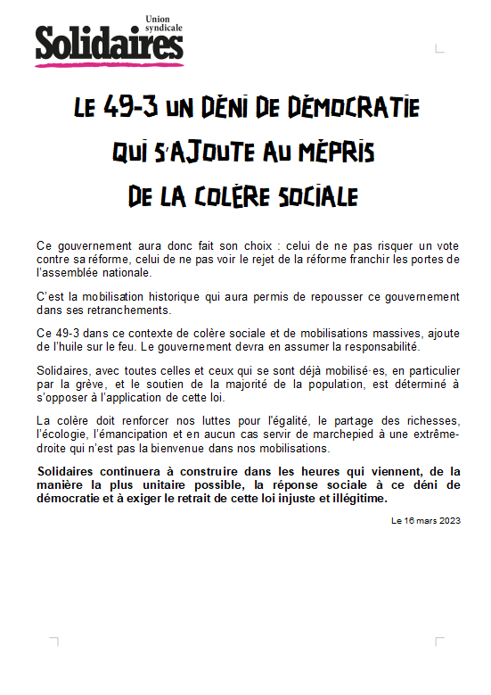 Solidaires, avec toutes celles et ceux qui se sont déjà mobilisé·es, en particulier par la grève, et le soutien de la majorité de la population, est déterminé à s’opposer à l’application de cette loi.