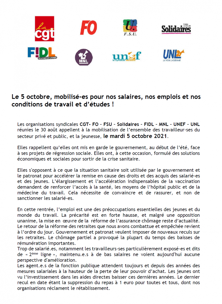 réunies le 30 août appellent à la mobilisation de l’ensemble des travailleur-ses du secteur privé et public, et la jeunesse, le mardi 5 octobre 2021.Elles rappellent qu’elles ont mis en garde le gouvernement, au début de l’été, face à ses projets de régression sociale. Elles ont, à cette occasion, formulé des solutions économiques et sociales pour sortir de la crise sanitaire.