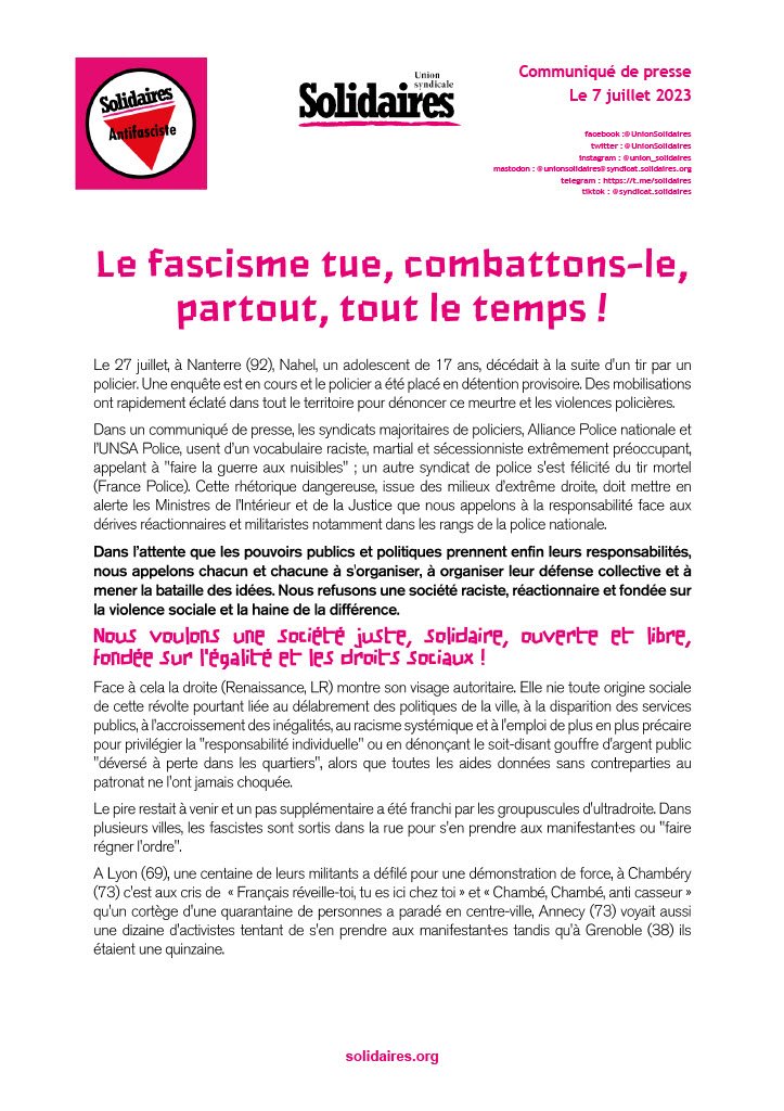 Dans un communiqué de presse, les syndicats majoritaires de policiers, Alliance Police nationale et l’UNSA Police, usent d’un vocabulaire raciste, martial et sécessionniste extrêmement préoccupant, appelant à "faire la guerre aux nuisibles" ; un autre syndicat de police s'est félicité du tir mortel (France Police). Cette rhétorique dangereuse, issue des milieux d’extrême droite, doit mettre en alerte les Ministres de l’Intérieur et de la Justice que nous appelons à la responsabilité face aux dérives réactionnaires et militaristes notamment dans les rangs de la police nationale.