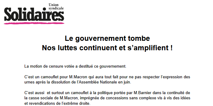 C’est aussi et surtout un camouflet à la politique portée par M.Barnier dans la continuité de la casse sociale de M.Macron, imprégnée de concessions sans complexe vis à vis des idées et revendications de l’extrême droite.