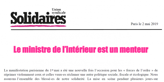 La manifestation parisienne du 1er mai a été une nouvelle fois l’occasion pour les « forces de l’ordre » de réprimer violemment ceux et celles venu-es réclamer une autre politique sociale, fiscale et écologique. Nous assurons l’ensemble des blessé-es de notre solidarité. La mise en scène pendant plusieurs jours sur la prétendue dangerosité de cette manifestation par les services de l'intérieur et le Ministre lui-même, relayés largement, ont tenté de décourager les manifestant-es. Cette manifestation a été un succès de participation portant des revendications justes et légitimes. Il s'agit ici de rétablir certaines vérités.