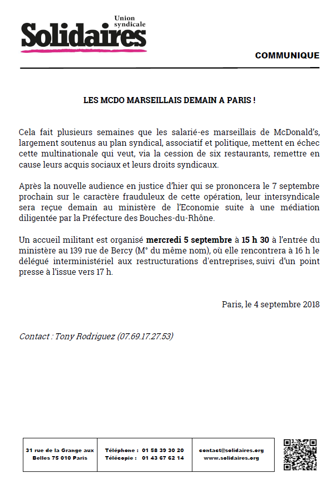 Cela fait plusieurs semaines que les salarié-es marseillais de McDonald’s, largement soutenus au plan syndical, associatif et politique, mettent en échec cette multinationale qui veut, via la cession de six restaurants, remettre en cause leurs acquis sociaux et leurs droits syndicaux.