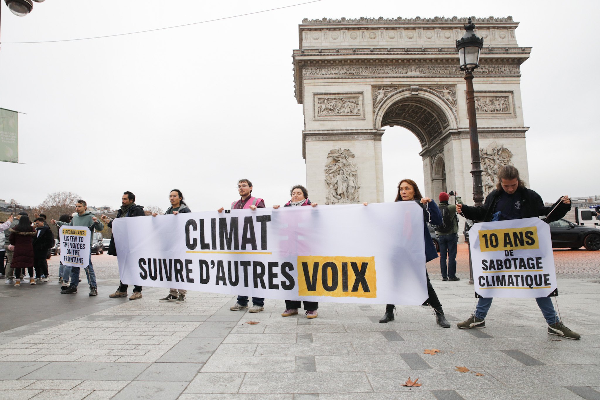 Les voies ainsi repeintes représentent les autres voies à prendre pour renouer avec une trajectoire climatique viable et juste. Le message “Climat : suivre d’autres voix” a été brandi sur le lieu de l’action pour exiger un changement de cap et le respect de l’accord de Paris.