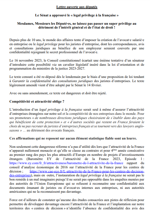 Lettre ouverte aux député∙es signée par CGT, FSU, Solidaires, SAF, SM, Global Chance, ANV COP 21 et Alternatiba contre le projet de créer l’avocat∙e salarié∙e en entreprise ou le legal privilege pour les juristes d’entreprise, dont les correspondances, avis et consultations juridiques au bénéfice de leur employeur seraient couverts par la confidentialité des consultations et avis qu'ils et elles produisent pour lui.