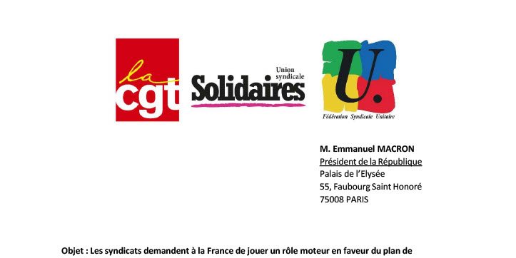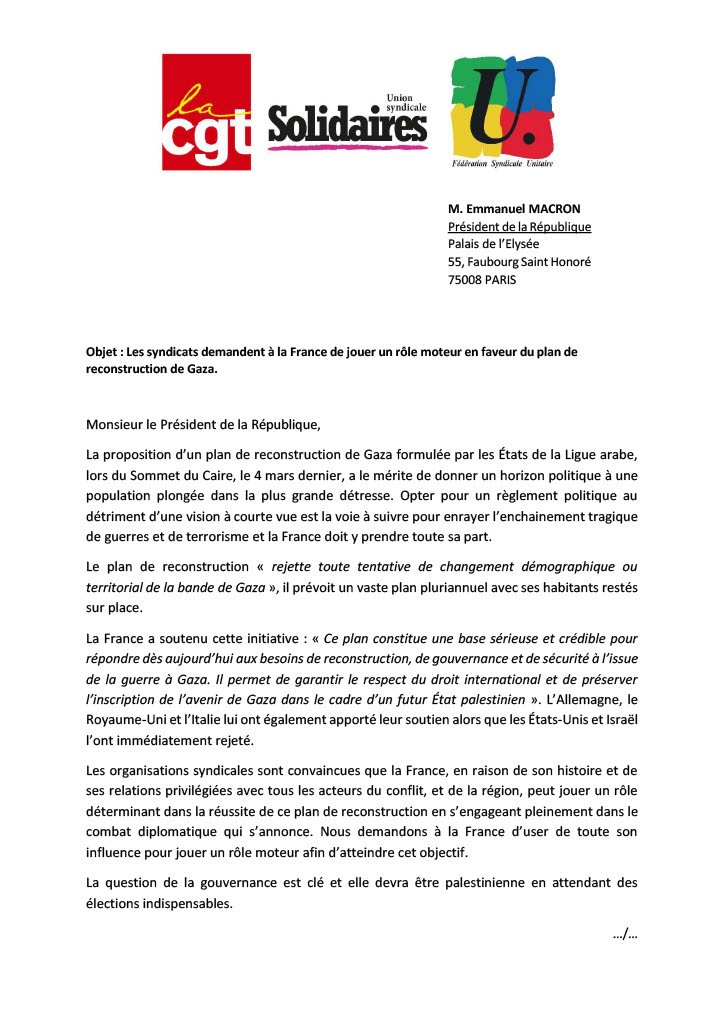 Les organisations syndicales sont convaincues que la France, en raison de son histoire et de ses relations privilégiées avec tous les acteurs du conflit, et de la région, peut jouer un rôle déterminant dans la réussite de ce plan de reconstruction en s’engageant pleinement dans le combat diplomatique qui s’annonce. Nous demandons à la France d’user de toute son influence pour jouer un rôle moteur afin d’atteindre cet objectif.
