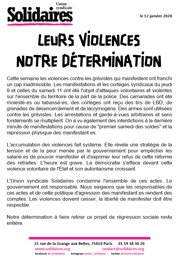 L'accumulation des violences fait système. Elle révèle une stratégie de la tension et de la peur menée par le gouvernement pour empêcher les salarié.es de pouvoir manifester et d'exprimer leur refus de cette réforme des retraites. L'heure est grave. La démocratie s'efface devant cette violence volontaire de l'État et son autoritarisme croissant.