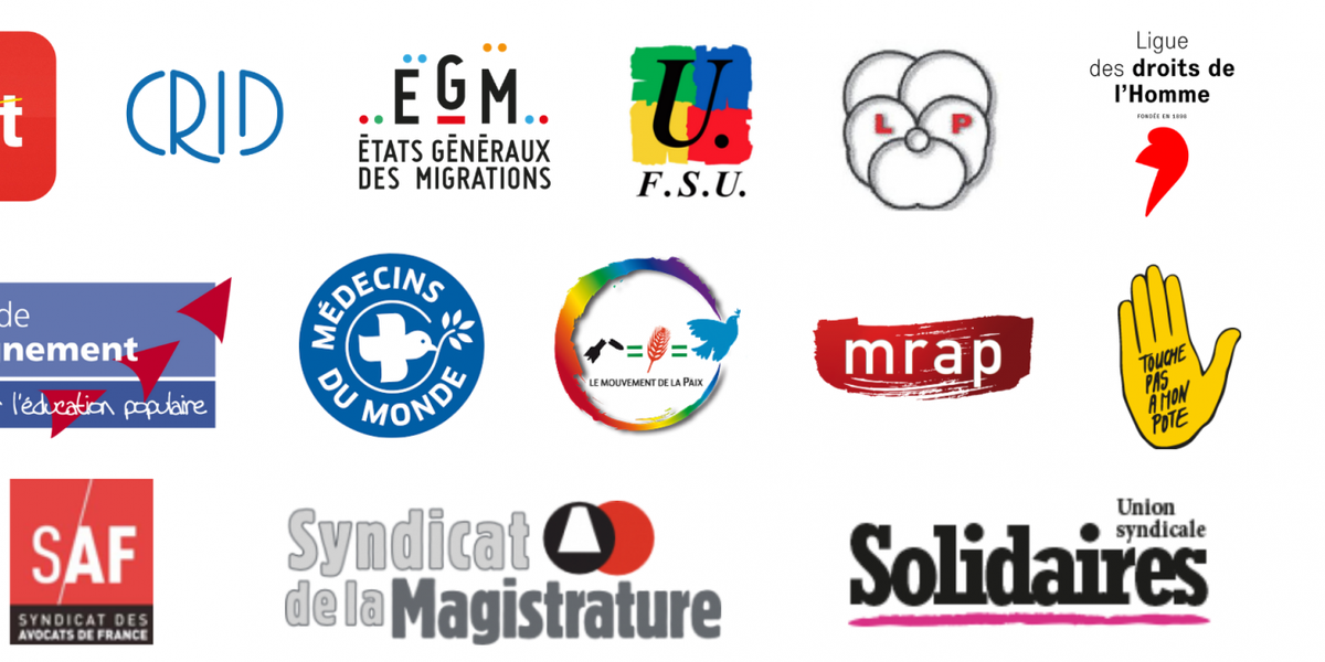 Signataires : CGT - CRID - États Généraux des Migrations - FSU - Libre Pensée - Ligue des droits de l’Homme - Ligue de l’Enseignement - Médecins du Monde - Mouvement de la Paix – MRAP - SOS Racisme - Syndicat des Avocats de France - Syndicat de la Magistrature - Union Syndicale Solidaires