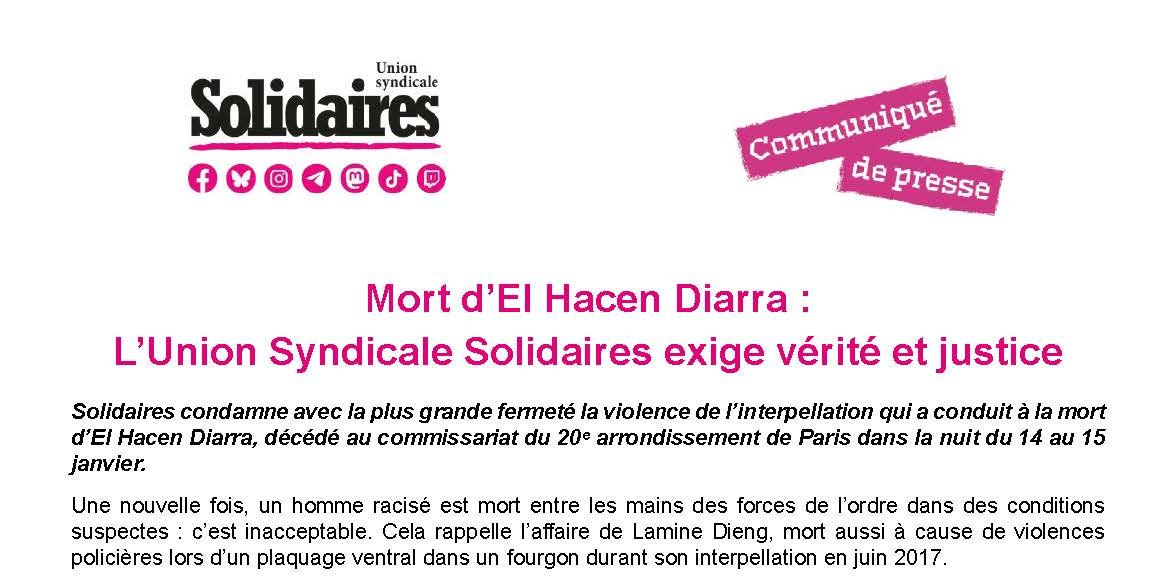 Solidaires condamne avec la plus grande fermeté la violence de l’interpellation qui a conduit à la mort d’El Hacen Diarra, décédé au commissariat du 20ᵉ arrondissement de Paris dans la nuit du 14 au 15 janvier. Une nouvelle fois, un homme racisé est mort entre les mains des forces de l’ordre dans des conditions suspectes : c’est inacceptable. Ça rappelle l’affaire de Lamine Dieng, mort aussi à cause de violences policières lors d’un plaquage ventral dans un fourgon durant son interpellation en juin 2017.