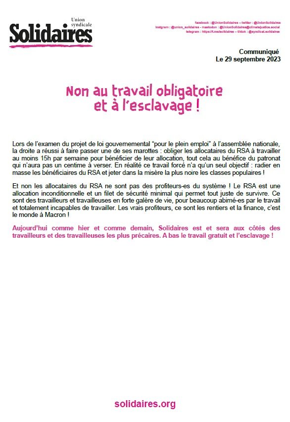 Lors de l’examen du projet de loi gouvernemental “pour le plein emploi” à l’assemblée nationale, la droite a réussi à faire passer une de ses marottes : obliger les allocataires du RSA à travailler au moins 15h par semaine pour bénéficier de leur allocation, tout cela au bénéfice du patronat qui n’aura pas un centime à verser. En réalité ce travail forcé n’a qu’un seul objectif : radier en masse les bénéficiaires du RSA et jeter dans la misère la plus noire les classes populaires !