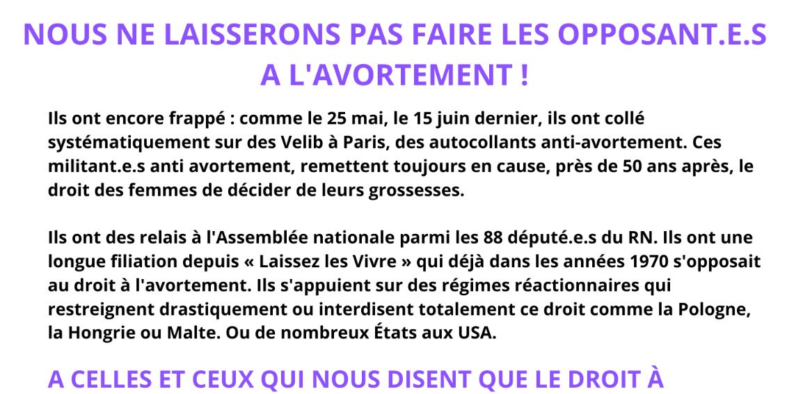 Ils ont encore frappé : comme le 25 mai, le 15 juin dernier, ils ont collé systématiquement sur des Velib à Paris, des autocollants anti-avortement. Ces militant-ess anti avortement, remettent toujours en cause, près de 50 ans après, le droit des femmes de décider de leurs grossesses. Ils ont des relais à l'Assemblée nationale parmi les 88 député-es du RN. Ils ont une longue filiation depuis « Laissez les Vivre » qui déjà dans les années 1970 s'opposait au droit à l'avortement.