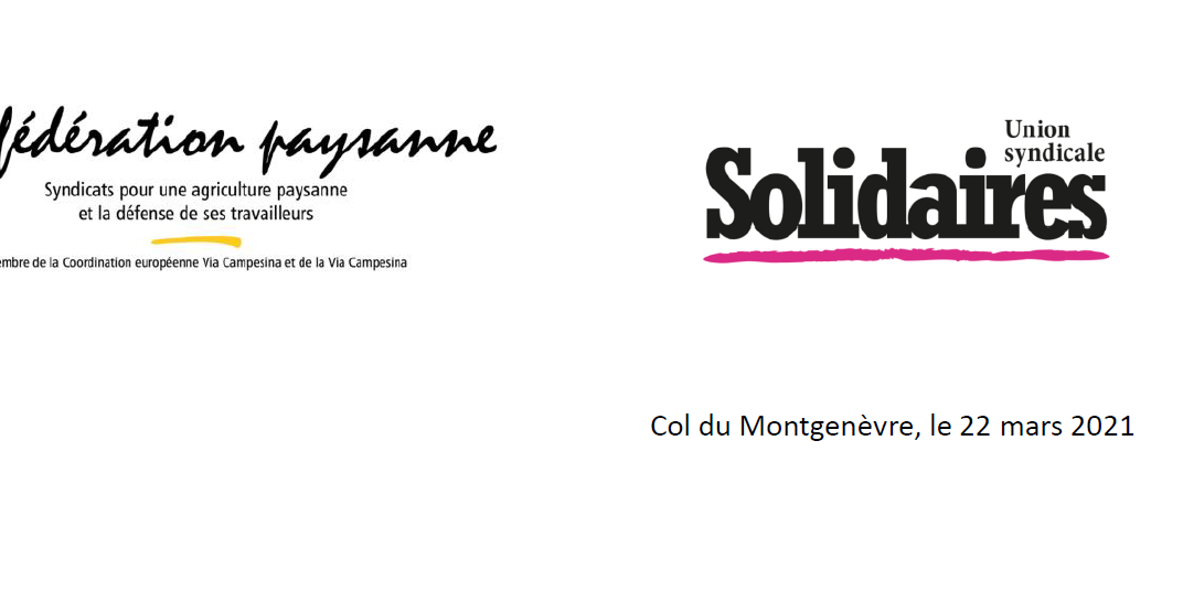 Pour une société respectueuse de tout-e-s, la liberté de circulation, la liberté d’installation et la régularisation sans condition de tout-e-s les migrant-e-s sont impératives. Dans ce contexte de répression la Confédération paysanne et l’union syndicale Solidaires réaffirment leur engagement auprès de toutes celles et ceux qui luttent pour la dignité humaine et aident les populations démunies.