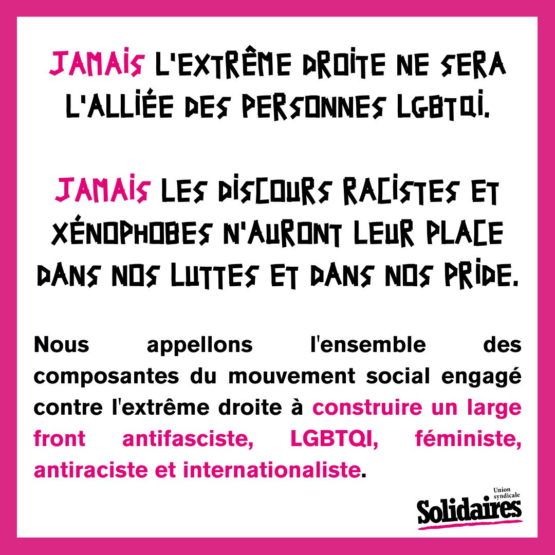 Samedi 29 juin, un collectif gay et lesbien d'extrême droite a tenté de répandre ses messages réactionnaires, racistes et xénophobes. Mais c'était sans compter sur la résistance de nombreux∙ses camarades LGBTQI, syndicalistes, militant×es politiques et associatif∙ves face au danger de l'extrême droite. Les militant×es d'extrême droite ont été repoussé·es avant de se réfugier derrière les forces de l'ordre. Mais l'histoire ne s'arrête pas là... Les militant×es d'extrême droite ont continué de nous provoquer et la police a d'abord arrêté deux camarades antifascistes, avant d'interpeller violemment plusieurs membres de Service d'Ordre de Solidaires.