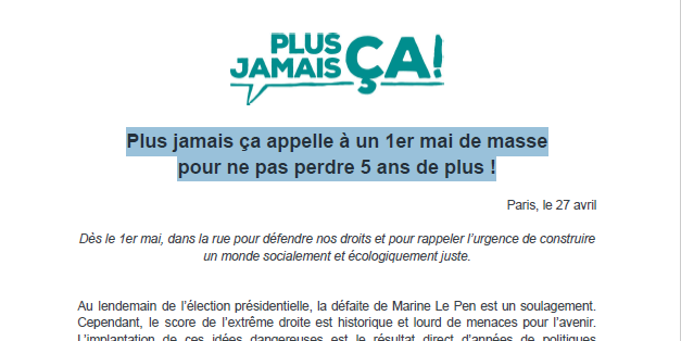 Dès ce week-end, en participant aux manifestations du 1er mai à l'appel des organisations syndicales et de jeunesse, nous rappellerons que nous ne cautionnons pas le programme politique d’Emmanuel Macron, qui est une menace directe pour nos droits sociaux, pour la planète et qui constitue le terreau dont se nourrit l’extrême droite.