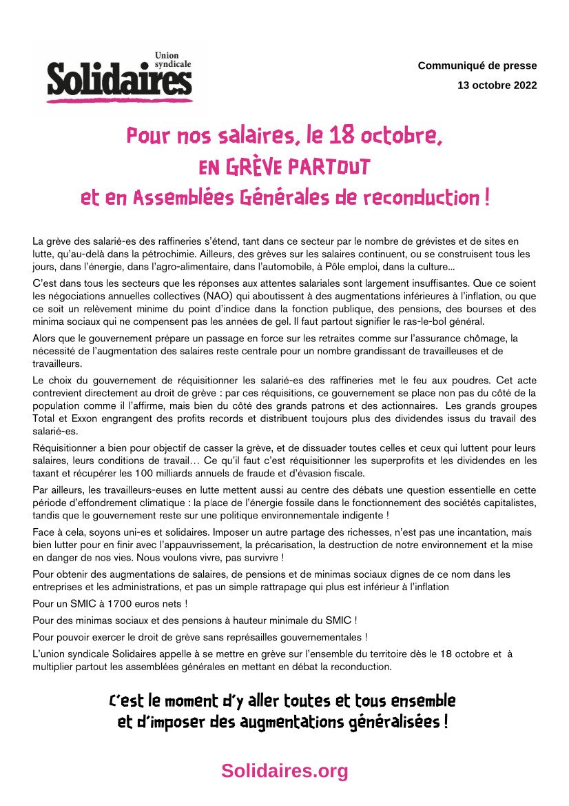 L’union syndicale Solidaires appelle à se mettre en grève sur l’ensemble du territoire dès le 18 octobre et à multiplier partout les assemblées générales en mettant en débat la reconduction.