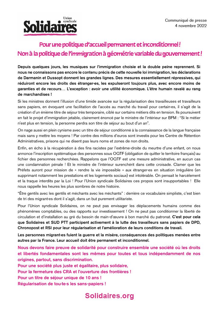 Pour l’Union syndicale Solidaires, on ne peut pas envisager les déplacements humains comme des phénomènes comptables, ou des rapports sur investissement ! On ne peut pas conditionner la liberté de circulation et d’installation au gré du besoin de main-d'œuvre à bon marché du patronat. C’est pour cela que Solidaires et SUD PTT participent activement à la lutte des travailleurs sans papiers de DPD, Chronopost et RSI pour leur régularisation et l’amélioration de leurs conditions de travail.
