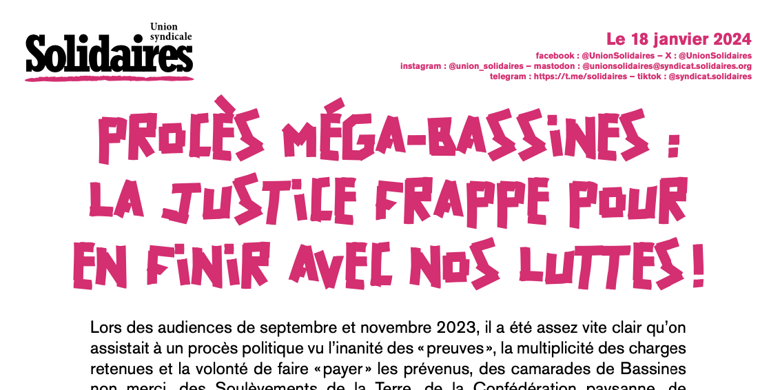 L’Union syndicale Solidaires dénonce avec force la répression qui continue de s’abattre sur les militant·es écologistes et les syndicalistes.