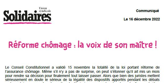 Le Conseil Constitutionnel a validé le 15 décembre la totalité de la loi portant réforme de l’assurance chômage. Même s’il n’y a pas de surprise, on peut s’étonner qu’il ait mis un mois pour rendre sa décision pour finalement tout laisser passer. Alors que bien des juristes mettent sérieusement en doute le sérieux de la légalité des dispositifs apportés pendant les débats parlementaires comme la présomption de démission pour un abandon de poste d’un-e salarié-e, disposition qui pourrait être contraire à la Convention 158 de l’OIT, le Conseil Constitutionnel n’en a eu cure et a validé le dispositif. C’est dire la pertinence et la légitimité de cette décision regrettable qui participe elle aussi à la casse des droits des travailleurs-euses les plus modestes.