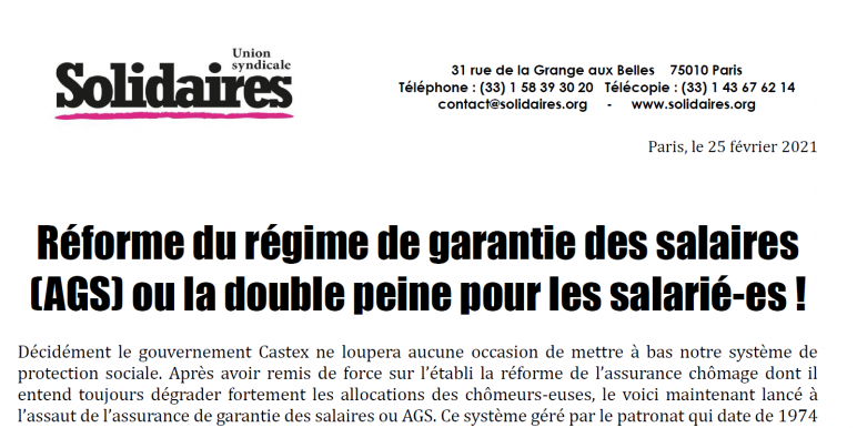 Décidément le gouvernement Castex ne loupera aucune occasion de mettre à bas notre système de protection sociale. Après avoir remis de force sur l’établi la réforme de l’assurance chômage dont il entend toujours dégrader fortement les allocations des chômeurs-euses, le voici maintenant lancé à l’assaut de l’assurance de garantie des salaires ou AGS. Ce système géré par le patronat qui date de 1974 permet en effet en cas de défaillance d’un employeur lors d’une liquidation judiciaire d’assurer en priorité le versement des salaires ainsi que les indemnités de congés payés et de licenciement des salarié-es de l’entreprise concernée. Une fois celles-ci versées, l’AGS dispose d’un « super privilège » lui permettant de se rembourser en premier sur le produit de la revente des actifs de l’entreprise par le mandataire judiciaire.