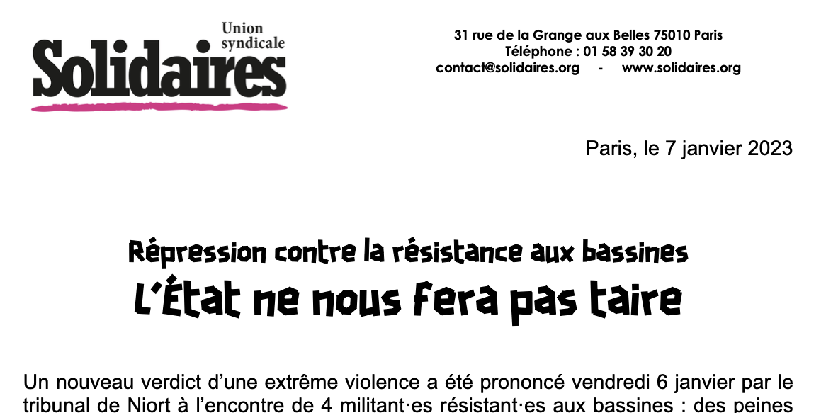 L’Union syndicale Solidaires dénonce avec force cette répression orchestrée par l’État en soutien au lobby agro-industriel. Nous apportons notre soutien aux militant·es condamné·es injustement pour l'exemple.