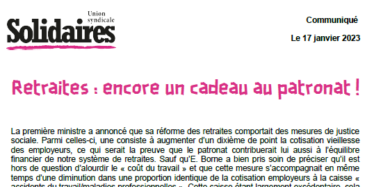 C’est l’injustice qui est le sujet de cette réforme comme de celle de l’assurance chômage ou encore du RSA conditionnel. Et si le patronat n’a guère tremblé à l’annonce de la première ministre, il pourrait bien trembler devant le mouvement social à venir. Et cela commence par un coup de semonce le 19 janvier puis ensuite. Tous et toutes en grève et dans la rue !