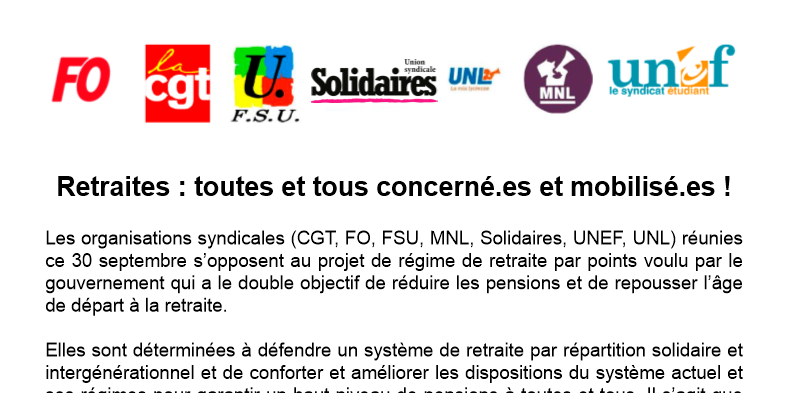 Les organisations syndicales (CGT, FO, FSU, MNL, Solidaires, UNEF, UNL) réunies ce 30 septembre s’opposent au projet de régime de retraite par points voulu par le gouvernement qui a le double objectif de réduire les pensions et de repousser l’âge de départ à la retraite.