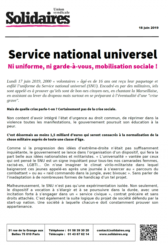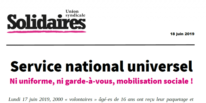 Comme si la progression des idées d’extrême-droite n’était pas suffisamment inquiétante, le gouvernement se lance dans l’organisation d’un dispositif, qui fera la part belle aux idées nationalistes et militaristes. « L’universalité » vantée par ceux qui ont pensé le SNU est un signe inquiétant pour tous-tes nos camarades femmes, racisé-es, LGBTI… On n’ose imaginer le climat virilo-militariste dans lequel baigneront ces jeunes appelé-es après une journée à s’exercer au « parcours du combattant » ou au « raid commando dans la jungle, avec bivouac ». Sans parler de l'inadaptation à de nombreuses formes de handicap d’un tel projet.