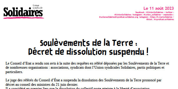 Dès lors le Conseil d’État, statuant en référé a suspendu la dissolution des Soulèvements de la Terre.