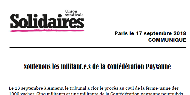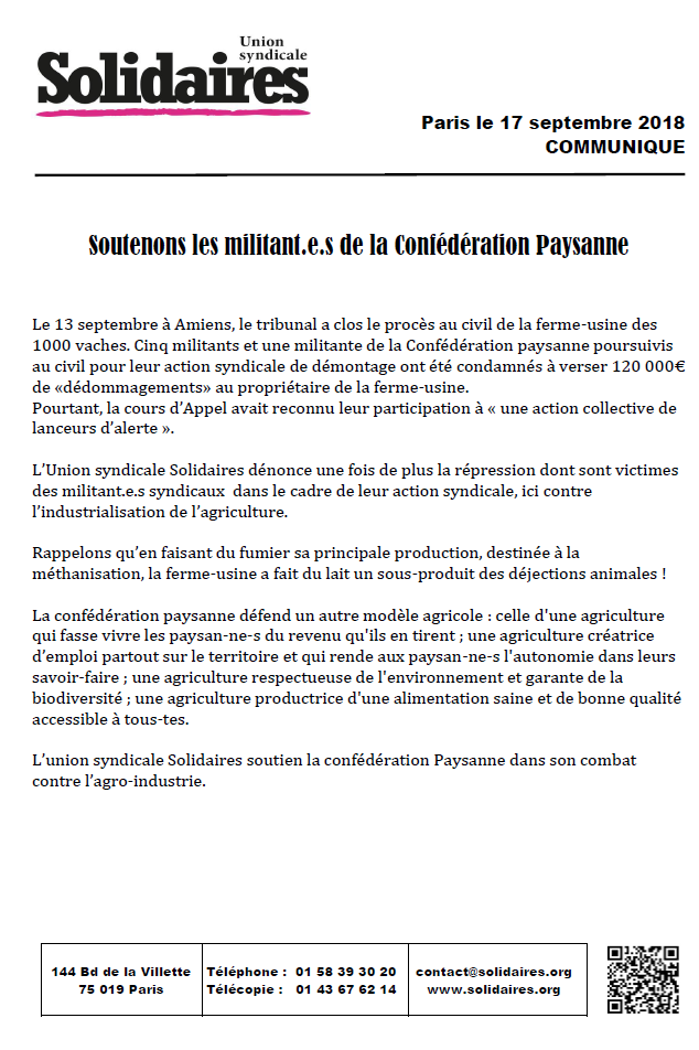 L’union syndicale Solidaires soutien la confédération Paysanne dans son combat contre l’agro-industrie.