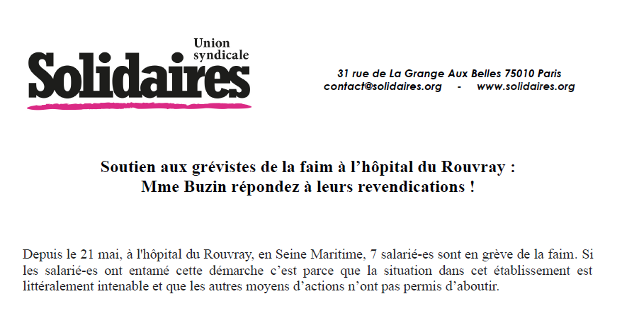 Depuis le 21 mai, à l'hôpital du Rouvray, en Seine Maritime, 7 salarié-es sont en grève de la faim. Si les salarié-es ont entamé cette démarche c’est parce que la situation dans cet établissement est littéralement intenable et que les autres moyens d’actions n’ont pas permis d’aboutir.