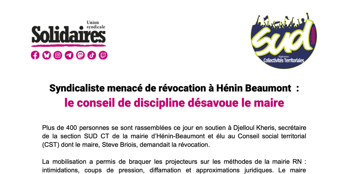 Le conseil de discipline s’est prononcé pour une absence de sanction. Cela confirme notre lecture : le dossier est vide et la procédure vise uniquement à museler un syndicaliste et tenter de couler la section SUD CT de la mairie une année d’élections professionnelles.
