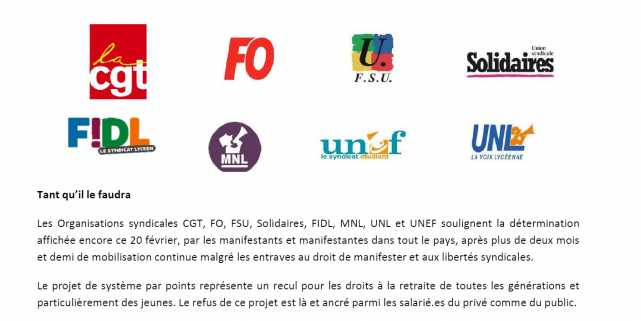 Les Organisations syndicales CGT, FO, FSU, Solidaires, FIDL, MNL, UNL et UNEF soulignent la détermination affichée encore ce 20 février, par les manifestants et manifestantes dans tout le pays, après plus de deux mois et demi de mobilisation continue malgré les entraves au droit de manifester et aux libertés syndicales.