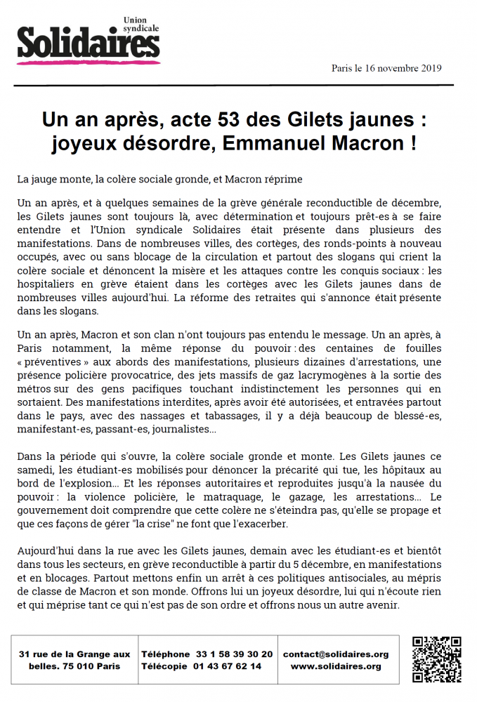Un an après, et à quelques semaines de la grève générale reconductible de décembre, les Gilets jaunes sont toujours là, avec détermination et toujours prêt-es à se faire entendre et l’Union syndicale Solidaires était présente dans plusieurs des manifestations. Dans de nombreuses villes, des cortèges, des ronds-points à nouveau occupés, avec ou sans blocage de la circulation et partout des slogans qui crient la colère sociale et dénoncent la misère et les attaques contre les conquis sociaux : les hospitaliers en grève étaient dans les cortèges avec les Gilets jaunes dans de nombreuses villes aujourd'hui. La réforme des retraites qui s'annonce était présente dans les slogans.