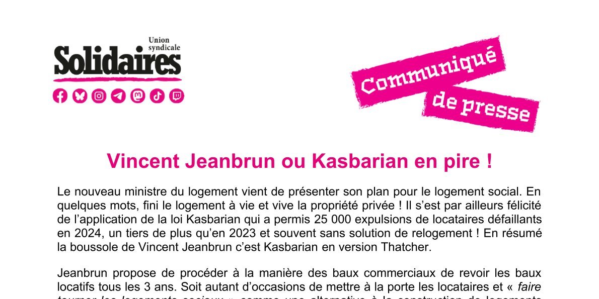 Le nouveau ministre du logement vient de présenter son plan pour le logement social. En quelques mots, fini le logement à vie et vive la propriété privée ! Il s’est par ailleurs félicité de l’application de la loi Kasbarian qui a permis 25 000 expulsions de locataires défaillants en 2024, un tiers de plus qu’en 2023 et souvent sans solution de relogement ! En résumé la boussole de Vincent Jeanbrun c’est Kasbarian en version Thatcher.