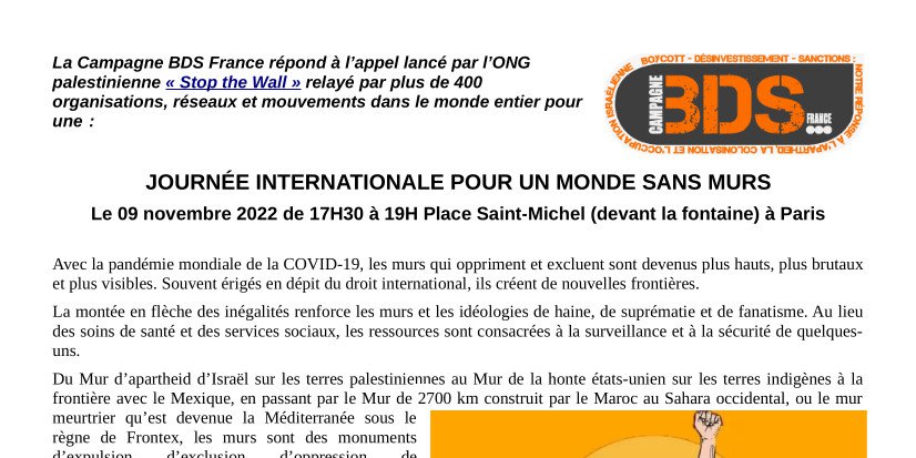Pour la 6ème édition de cette journée internationale, nous souhaitons manifester notre solidarité avec toutes les personnes victimes des murs, de tous les murs, qu’ils soient réels ou sous d’autres formes d’exclusion et d’exploitation, telles que les politiques coloniales encore menées contre l’autodétermination des peuples. Nous appelons les personnes de conscience à se joindre à nous, et à créer des liens avec les victimes de ces murs.