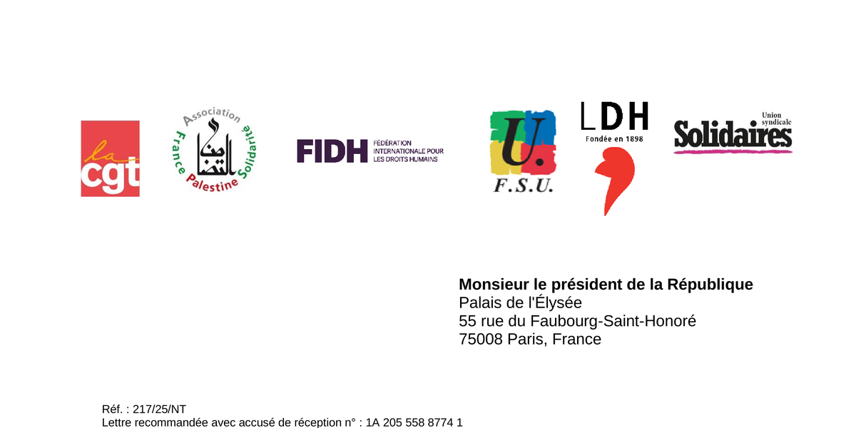 Anne Tuaillon, présidente de l’Association France Palestine Solidarité (AFPS) ; Sophie Binet, secrétaire générale de la Confédération générale du travail (CGT) ; Eléonore Morel, présidente de la Fédération internationale pour les droits humain (FIDH) ; Caroline Chevé, secrétaire générale de la Fédération Syndicale Unitaire (FSU) ; Nathalie Tehio, présidente de la LDH (Ligue des droits de l’Homme) ; Julie Ferrua et Murielle Guilbert, co-déléguées générales de l’Union syndicale Solidaires