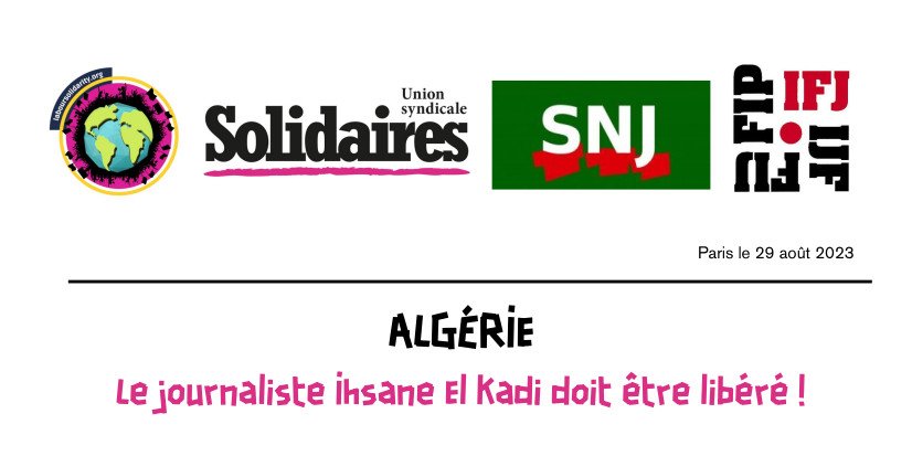 Le Syndicat national des journalistes (SNJ), première organisation de la professsion, l’Union syndicale Solidaires et la Fédération internationale des journalistes (FIJ) demandent la libération immédiate d’Ihsane El Kadi. Nos organisations réclament la fin de la censure et de la répression ciblée exercées contre les médias et journalistes indépendants en Algérie au moyen d’articles du Code pénal rédigés en termes vagues, utilisés pour violer le droit à la liberté d’expression.
