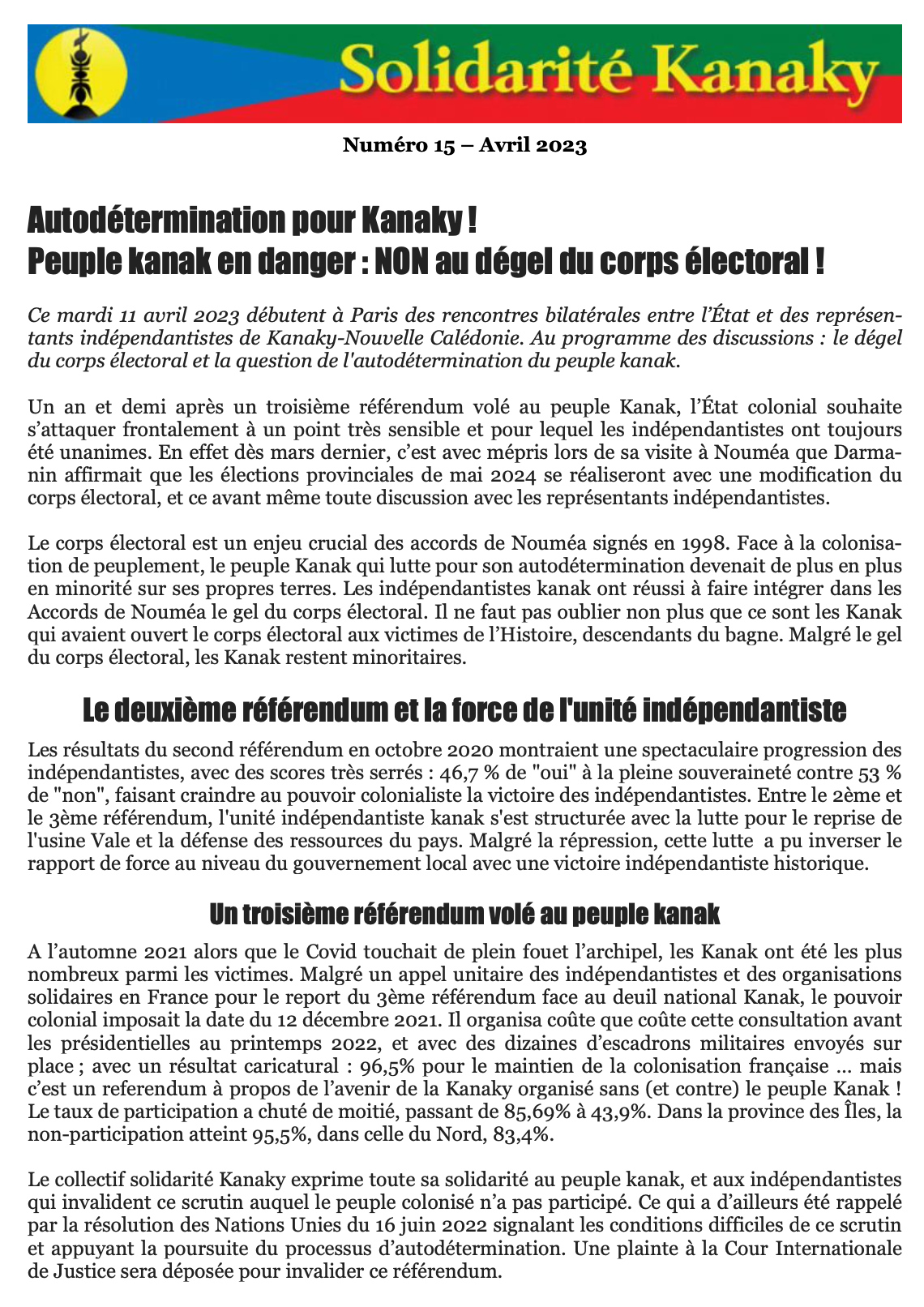 Le collectif solidarité Kanaky alerte par ce communiqué du danger et du risque historique pour le peuple kanak que serait un dégel du corps électoral, et se solidarise des courants indépendantistes kanak qui s’opposent à toute modification de celui-ci. Nous nous mobiliserons, et appelons à multiplier les actions en ce sens. Nous continuerons de dénoncer les conditions de déroulement du 3ème référendum, et resterons aux côtés du peuple kanak pour son autodétermination.