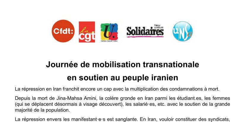 Le collectif intersyndical reste mobilisé aux côtés des iraniennes et des iraniens pour que leurs aspirations légitimes de liberté et de démocratie deviennent une réalité.