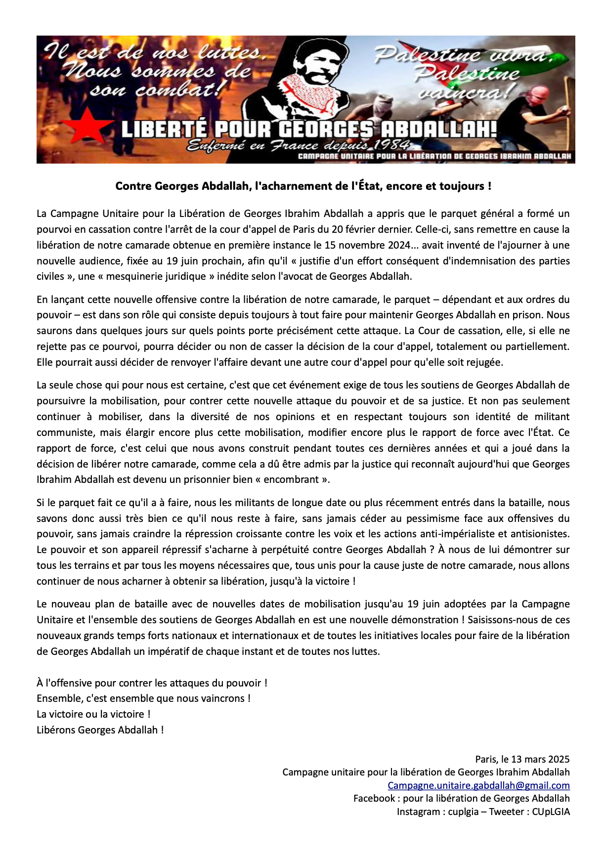 Si le parquet fait ce qu'il a à faire, nous les militants de longue date ou plus récemment entrés dans la bataille, nous savons donc aussi très bien ce qu'il nous reste à faire, sans jamais céder au pessimisme face aux offensives du pouvoir, sans jamais craindre la répression croissante contre les voix et les actions anti-impérialiste et antisionistes. Le pouvoir et son appareil répressif s'acharne à perpétuité contre Georges Abdallah ? À nous de lui démontrer sur tous les terrains et par tous les moyens nécessaires que, tous unis pour la cause juste de notre camarade, nous allons continuer de nous acharner à obtenir sa libération, jusqu'à la victoire !