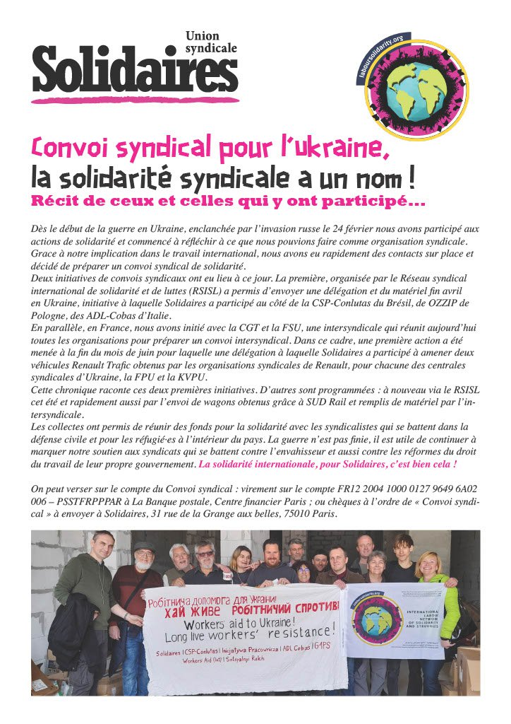 Deux initiatives de convois syndicaux ont eu lieu à ce jour. La première, organisée par le Réseau syndical international de solidarité et de luttes (RSISL) a permis d’envoyer une délégation et du matériel fin avril en Ukraine, initiative à laquelle Solidaires a participé au côté de la CSP-Conlutas du Brésil, de OZZIP de Pologne, des ADL-Cobas d’Italie.