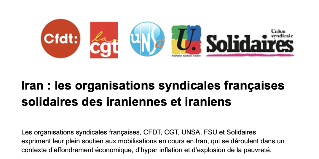 Les organisations syndicales françaises, CFDT, CGT, UNSA, FSU et Solidaires expriment leur plein soutien aux mobilisations en cours en Iran, qui se déroulent dans un contexte d’effondrement économique, d’hyper inflation et d’explosion de la pauvreté.