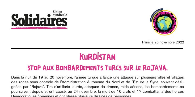 Dans la nuit du 19 au 20 novembre, l'armée turque a lancé une attaque sur plusieurs villes et villages des zones sous contrôle de l'Administration Autonome du Nord et de l'Est de la Syrie, souvent désignées par "Rojava". Tirs d'artillerie lourde, attaques de drones, raids aériens, les bombardements se poursuivent depuis et ont causé, au 24 novembre, la mort de 16 civils et 17 combattants des Forces Démocratiques Syriennes et ont blessé plusieurs dizaines de personnes.